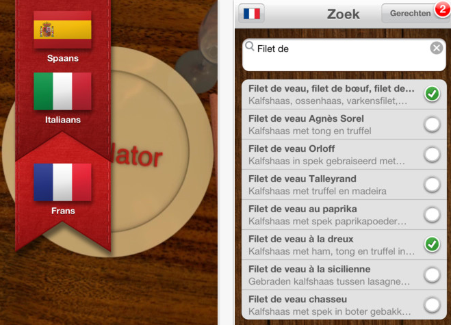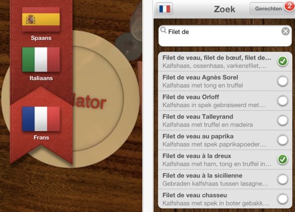 Et voila: de Dishlator was geboren. Een app waarmee je van ruim 5000 gerechten uit drie landen (Spanje, Frankrijk en Italië) kan checken wat het in het Nederlands is. Ook slim: als je de app eenmaal gedownload hebt, zijn de vertalingen offline beschikbaar (wel zo handig in ’t buitenland). Daarnaast kun je favorieten opslaan, zodat je altijd weet hoe je lievelingsgerecht heet.