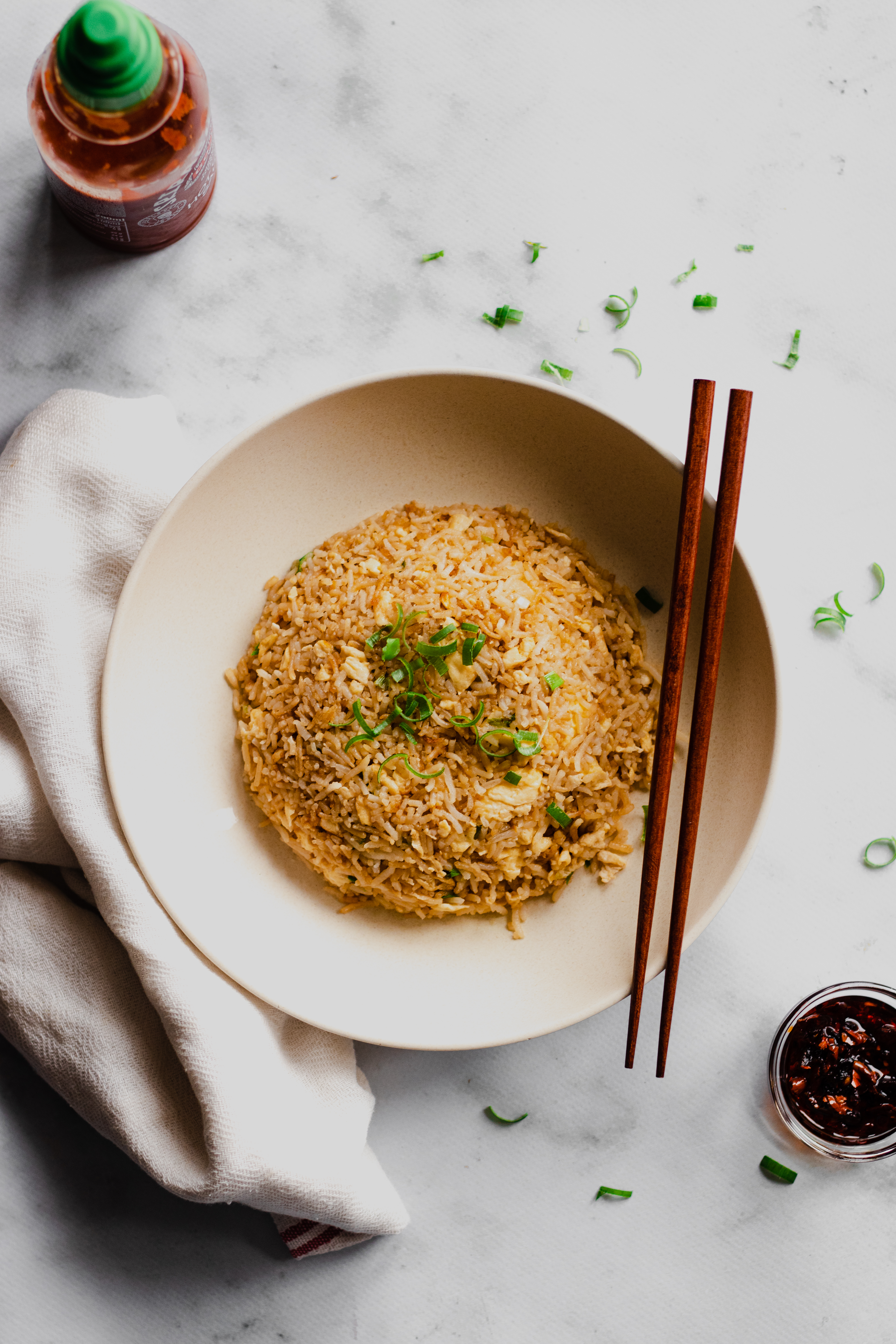 - Gekookte rijst, liefst minimaal 24 tot 48 uur oud. Wij leggen het bijvoorbeeld na het koken op een tray in de koelkast om lichtjes te drogen. Zo krijg je perfecte losse rijstkorrels in je wok en geen kleefrijst.