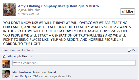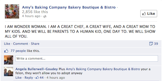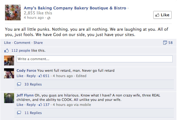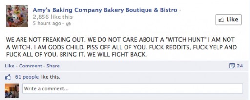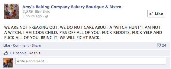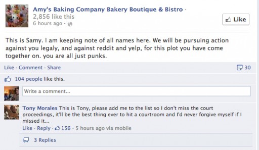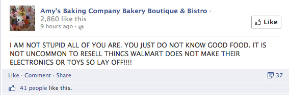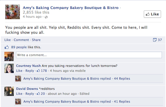 Wat gebeurt er als boze restauranteigenaren op Facebook gaan reageren op negatief commentaar van gasten? Het kan goed gaan, maar het kan ook slecht aflopen. Dat gebeurde bij Amy’s Baking Company Bakery Boutique & Bistro, een Amerikaans restaurant in Arizona.