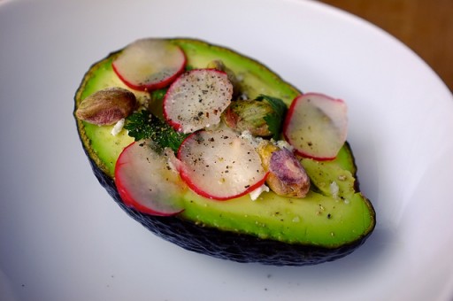 5. Een bijzondere maar hele lekkere combinatie: een avocado gevuld met geitenkaas, radijs, pistachenoten en wat koriander.