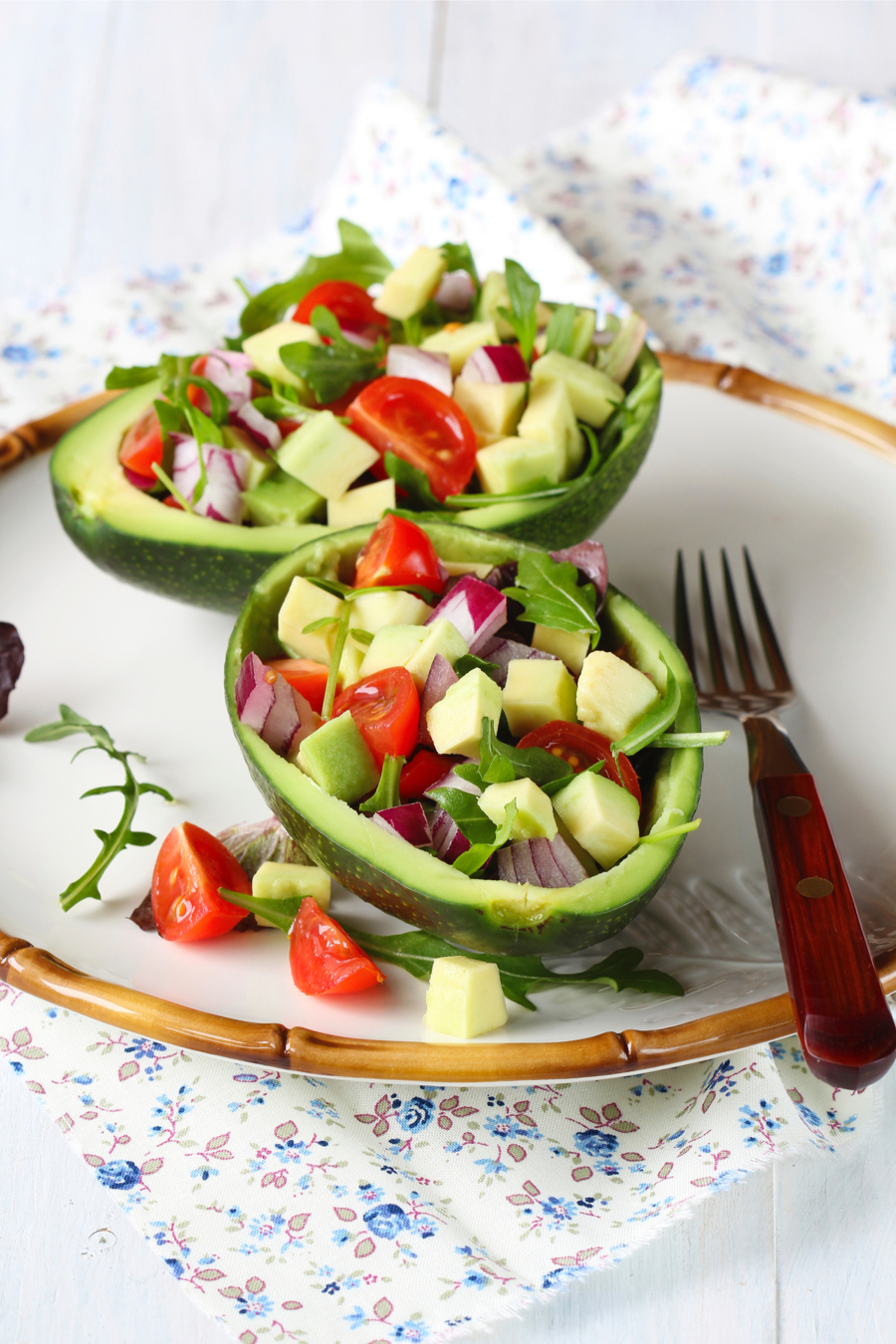 1. Een snel en simpel idee voor een bijgerecht: vul de avocado met blokjes avocado-vlees, tomaaatjes, rode ui, komkommer en rucola.