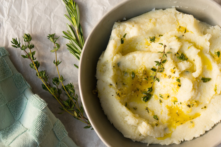 Vervang aardappelpuree door deze bloemkoolpuree en je bent lekker healthy bezig. Extra groenten, ahoy! Mét knoflookolie en kruiden.