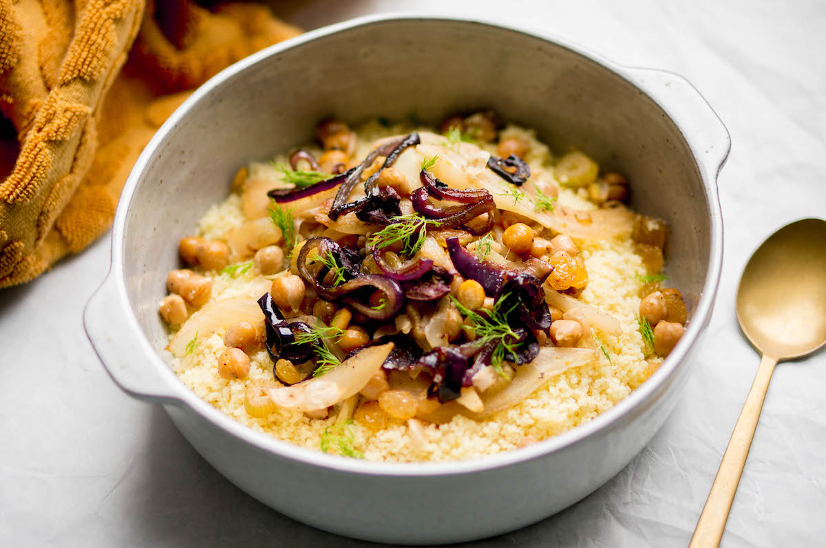 Naar recept: Couscous met venkel, olijven en gekaramelliseerde rode ui