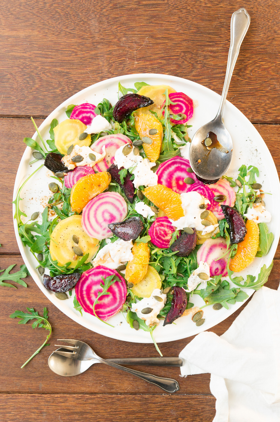 Bietjes zijn wat ons betreft één van de lekkerste ingrediënten om in een salade te verwerken. In combinatie met burrata, sinaasappels en pompoenpitten heb je echt een feestje op je bord.