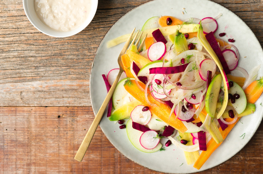 Naar recept:Â Salade van rauwe groente met tahindressing