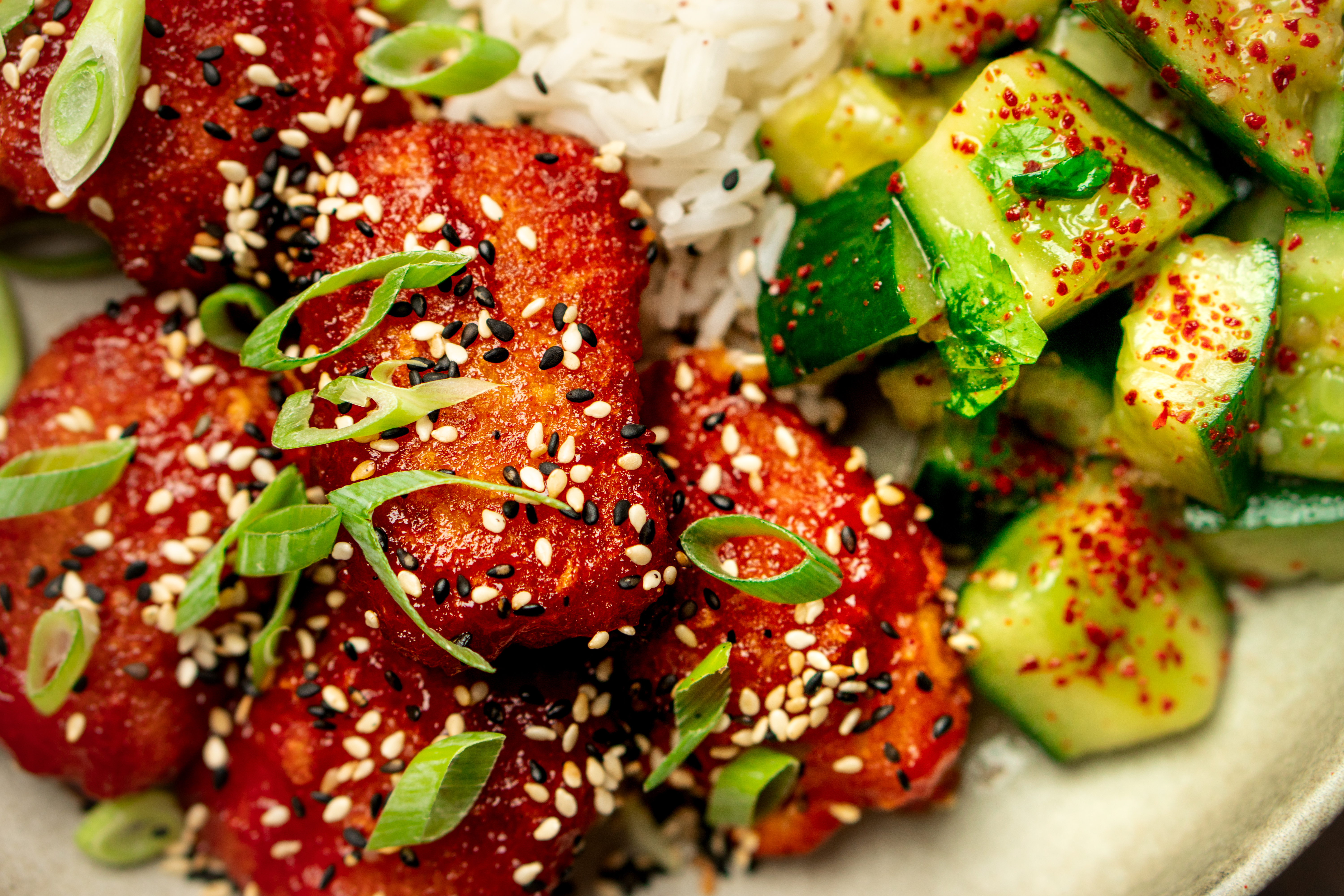 8. Korean fried kibbeling met rijst & smashed komkommersalade