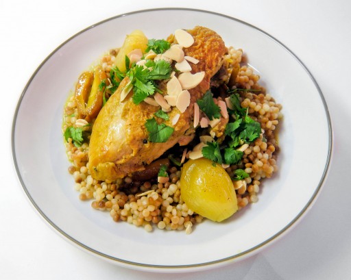 Een Marokkaanse salade met gegrilde kip, pannenkoekenbeslag, koekjes, taart, over ijs.