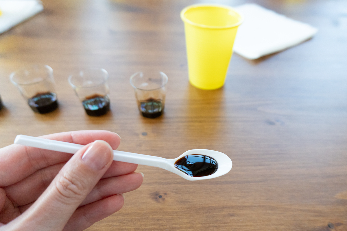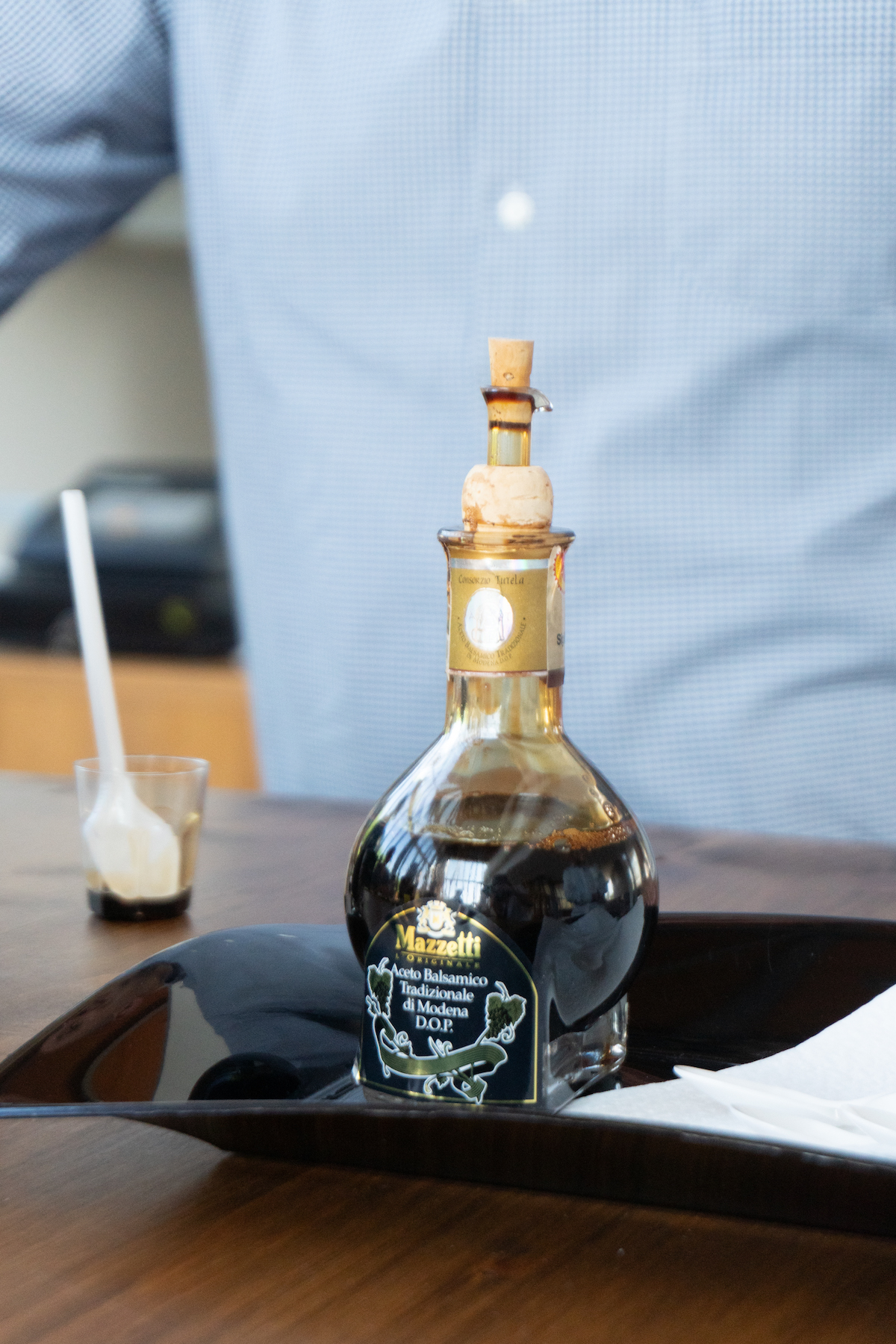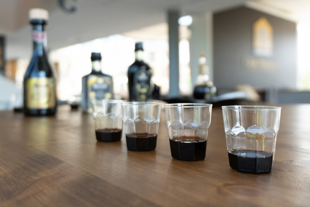 We sluiten onze rondleiding door de balsamico-brouwerij af met een balsamico-proeverij, waarbij we van balsamico met drie blaadjes tot aan de meest luxe en geconcentreerde Aceto Balsamico Tradizionale di Modena D.O.P. gaan. Daar hebben we even 25 jaar geschiedenis op een lepel, jongens.