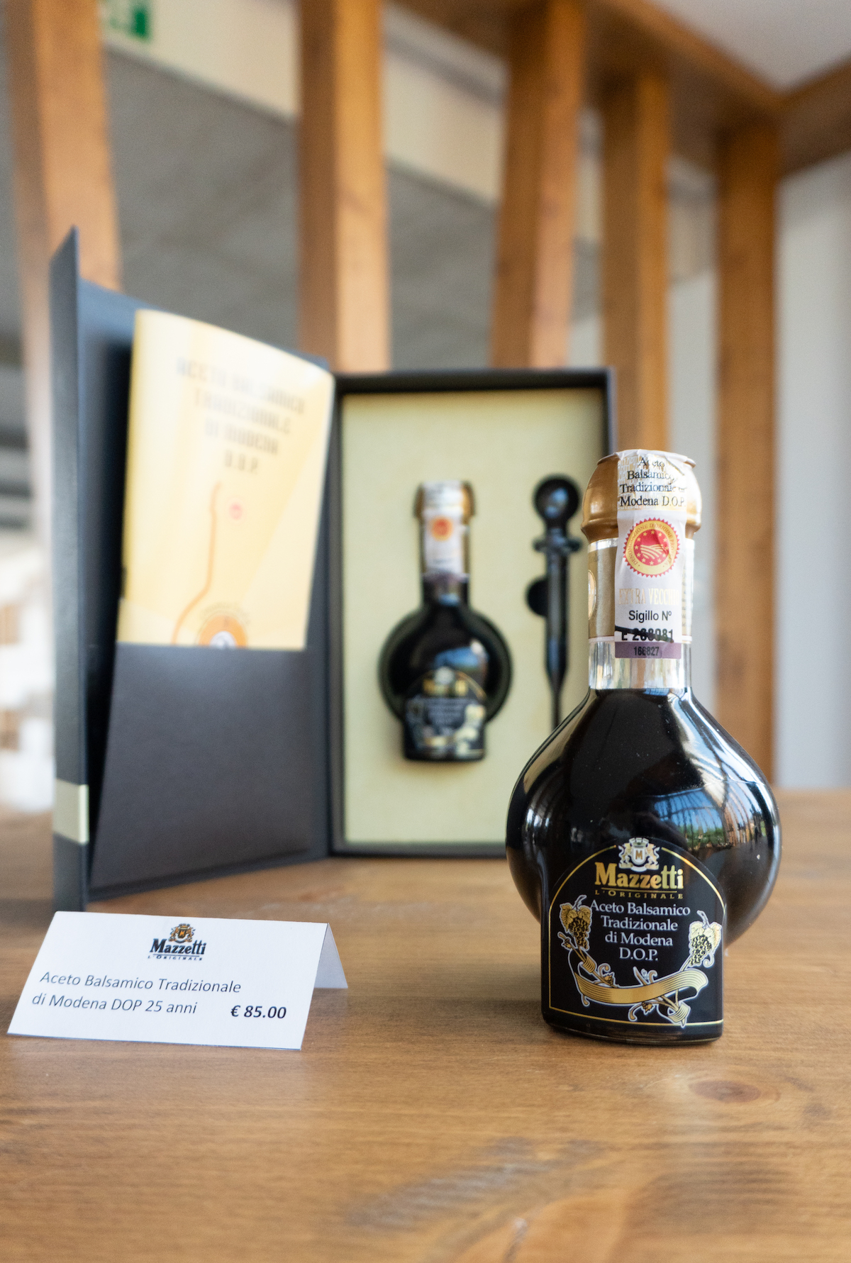 Waar de supermarktvariant van balsamico vervolgens minimaal 60 dagen hoeft te rijpen om zichzelf balsamico te mogen noemen, houdt Mazzetti een tijd aan van twee jaar (te herkennen aan een rood label) tot drie jaar (te herkennen aan een goudkleurig label). De ambachtelijke variant laten ze wel 12 tot 25 jaar rijpen. Balsamico van de lange adem dus.