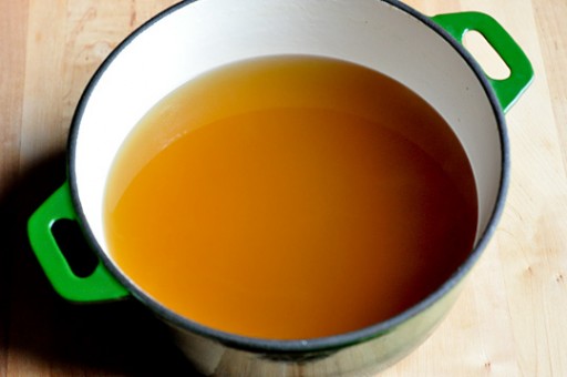 Proef de bouillon en wanneer je ongeveer tweederde van het sap over hebt, zou het genoeg moeten zijn. Zeef het geheel door een passeer- of schone theedoek en bewaar in een kom of glazen pot in de koelkast.