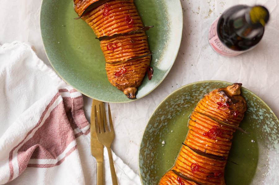 Hasselback pompoen met maple syrup en chilipeper