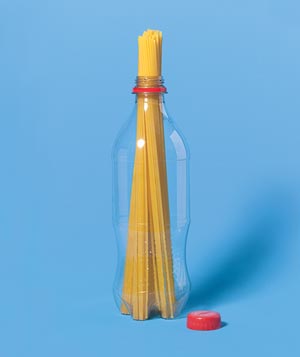 Spoel een lege frisdrankfles (minstens 0,75 liter inhoud) om met water en “vul” met spaghetti. De hoeveelheid die erin past is genoeg voor een ruime eter. Eet smakelijk!