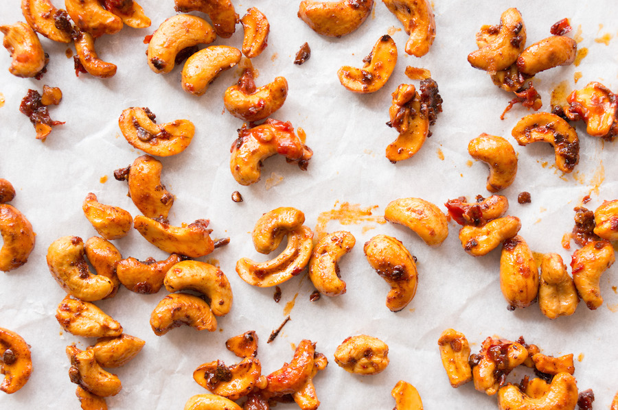 Denk aan geroosterde cashewnoten met sambal, met verse kruiden of met je eigen specerijenmix. Je kunt de noten droog roosteren in de pan en de smaken toevoegen, of gebruik er een lekkere klont boter bij.