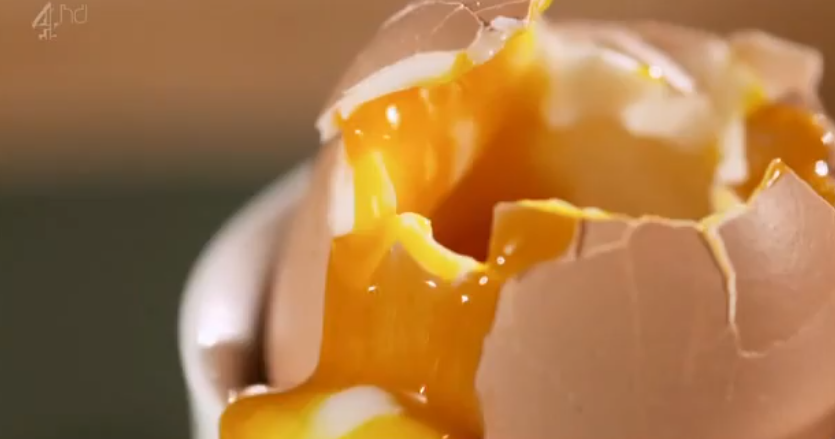 Hij begint met simpele gekookte eieren, maakt scrambled eggs, gepocheerde eieren, Scotch Eggs (gefrituurde eitjes met een worst-deegkorstje) en zelfs Bacon & Eggs ijs (hee, het is wel Blumenthal, he!).