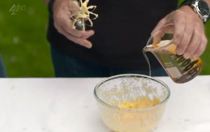 Heston maakt z’n mayonaise door 1 eidooier in een kom te doen, met een beetje mosterd. Kloppen met een garde. En dan langzaam olie toevoegen (uiteindelijk 150 ml), in een dun straaltje, terwijl je blijft kloppen met je garde. Drup voor drup hoeft niet, zegt hij. Je kunt wel een liter olie toevoegen voordat het echt gaat scheiden. In een dunne straal dus, en goed blijven kloppen. Uiteindelijk voeg je wat azijn en zout toe en klaar ben je!