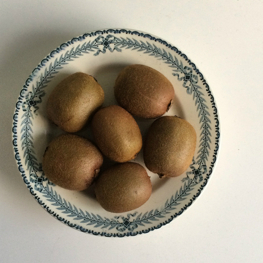 Ik ontbijt snel, want ik heb haast. Ik eet drie rijstwafels met vijgenjam. Tussendoor eet ik een kiwi.