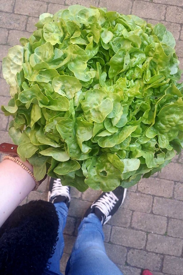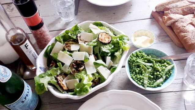 We eten een salade van sla uit onze moestuin met gegrilde groenten die over zijn van gisteren, met een lekkere dressing en Parmezaan. Daarbij wat doperwtjes en sugar snaps (ook uit eigen tuin!) met een boter met peterselie, zout en munt. En ook nog een focaccia met olie, boter en zout. Verder drink ik alleen maar water, en heb ik de hele dag last gehad van die verdomde chiazaadjes tussen m’n tanden. Doen we ook nooit meer.