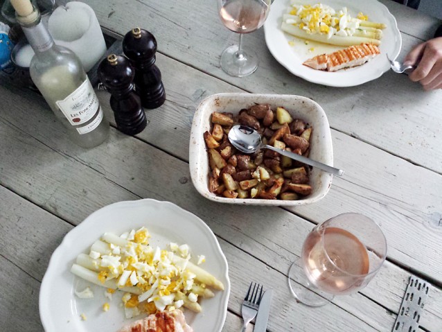 We eten weer laat, maar wel heel lekker. Asperges met ei en botersaus, gegrilde zalm en aardappeltjes uit de oven. Dit wil ik iedere dag wel! Daarna een wolkentoetje gegeten, echt helemáál niet lekker, maar toch opgegeten.