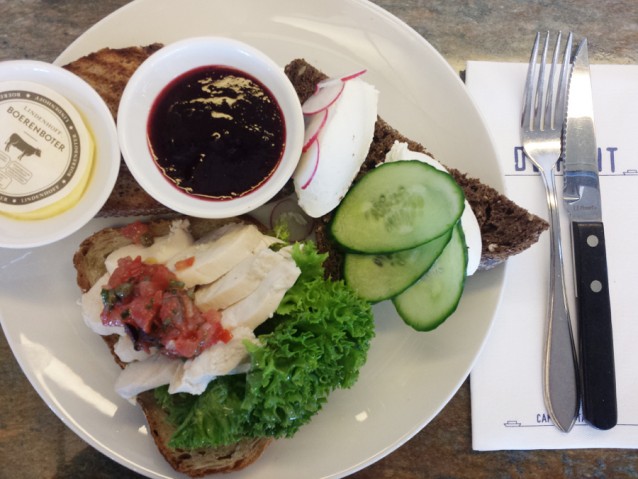 Het is superdruk op het terras, dus veel tijd om te eten en drinken tussendoor is er niet. Ik drink jus en de hele dag spa rood met munt en citroen. Lunch bestaat uit drie verschillende broodjes: eentje met in basilicum-olie gegaarde boerderijkip, een met een beetje pittige roomkaas met komkommer en radijs en nog eentje met een dikke laag lekkere boter en jam. Was iedere lunch tijdens m’n werk maar zo lekker en luxe!