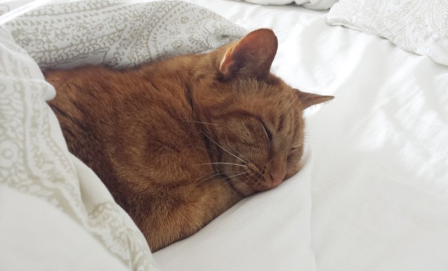 Beetje uitslapen vandaag, heerlijk. Ook de kat blijft lekker lang liggen. Daarna maar eens opstaan met een banaan, water en thee. Die bananen zijn handig joh, kan je gewoon eten terwijl je andere dingen doet!