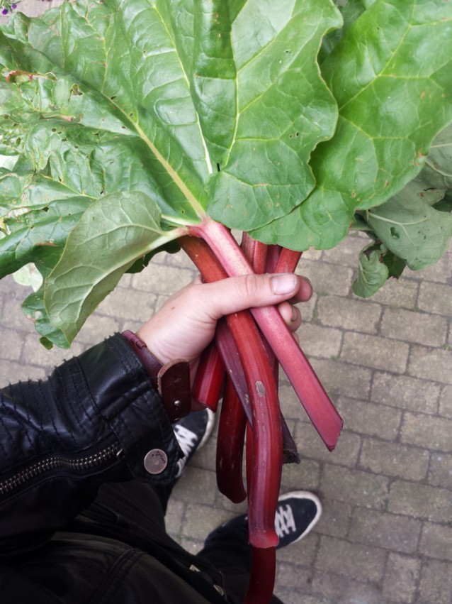 Ik sta laat op, rond 10.30. Ik drink thee en eet havermout, gewoon direct vanuit het pannetje, wandelend door het huis. Daarna pak ik een banaan en duik ik de keuken in om een rabarbertaart te maken. Ik heb namelijk nogal wat rabarber vanuit de moestuin.