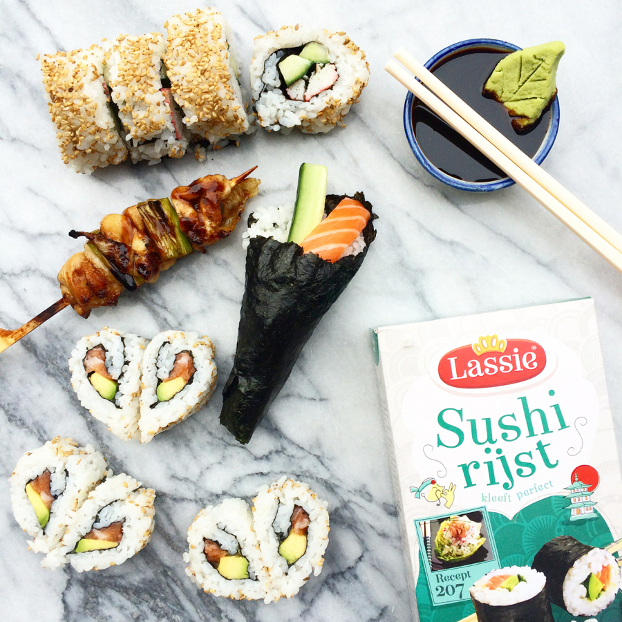 Na de klus race ik mezelf naar huis om me even op te frissen om vervolgens net op tijd aanwezig te zijn bij een leuk food event van Lassie waarvoor ik ben uitgenodigd. We leren sushi maken; ik vond dit echt superleuk om te doen en ik blijk een ‘natural’ te zijn. Zal het dan toch komen door mijn Asian roots? Ik eet mijn zelfgemaakte heerlijke sushi en een yakitori-stokje.