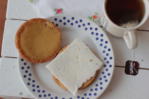 Als ontbijt eet ik een stuk galiameloen en twee rijstwafels met pindakaas, met een kopje thee. Tussendoor eet ik een aantal zelfgemaakte dadel-kokosballetjes en nog een stuk meloen.