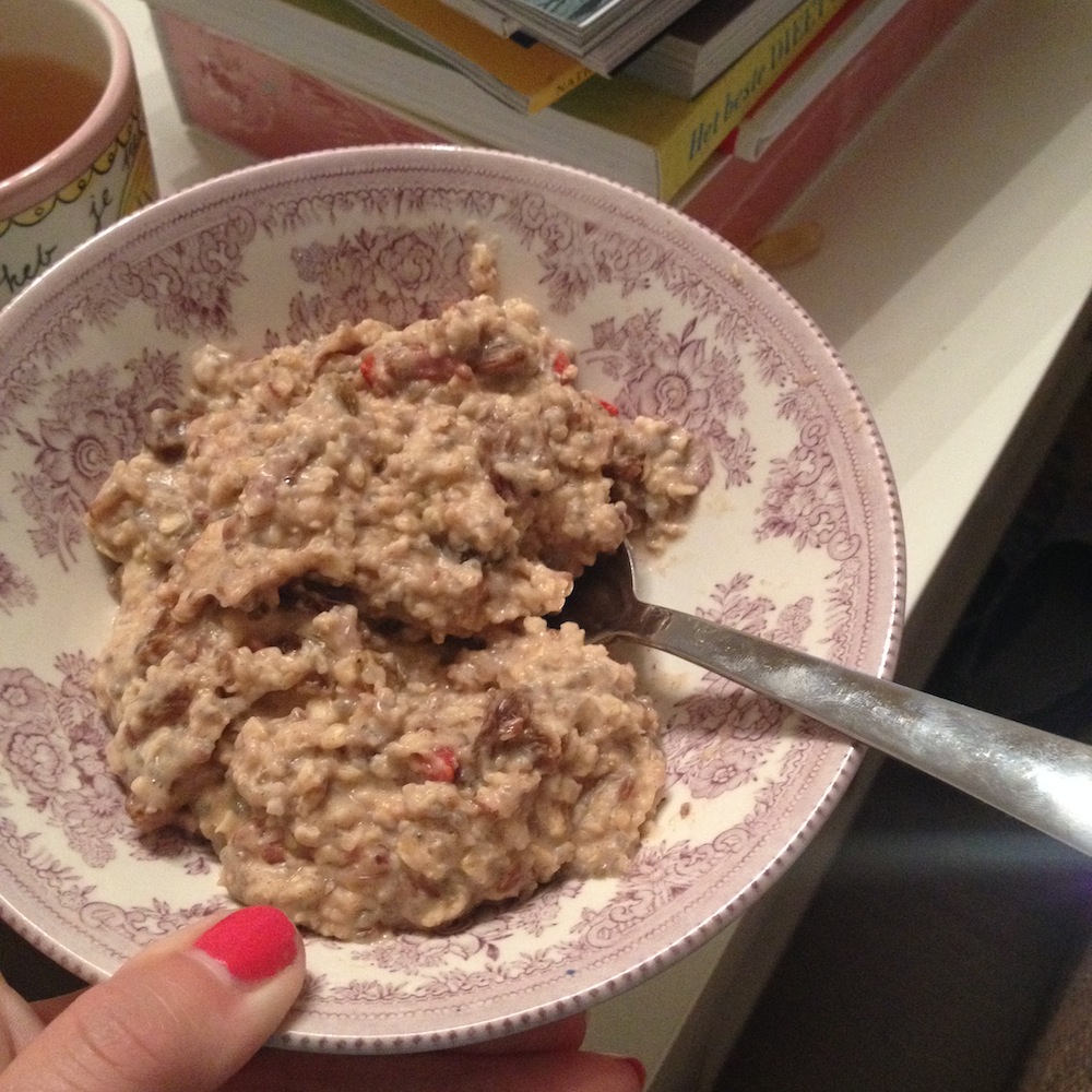 Stevig ontbijten met een kom havermoutpap op basis van amandelmelk met gojibessen, lijnzaad, chiazaad, rozijnen en lekker veel kaneel. Ik werk thuis, eet twee tomaten en ga dan naar Bloemendaal. Naast mijn blog werk ik voor Yoga Magazine, vandaag gaan we op het strand drie video’s opnemen voor de site. Tot 17.00 uur ben ik bezig met video’s opnemen. Bij de strandtent drink ik twee cappuccino’s met sojamelk, een muntthee en smul ik van de zandkoekjes erbij. Verder eet ik mijn meegebrachte speltboterhammen met kaas, komkommer en mosterd en later nog een appel.