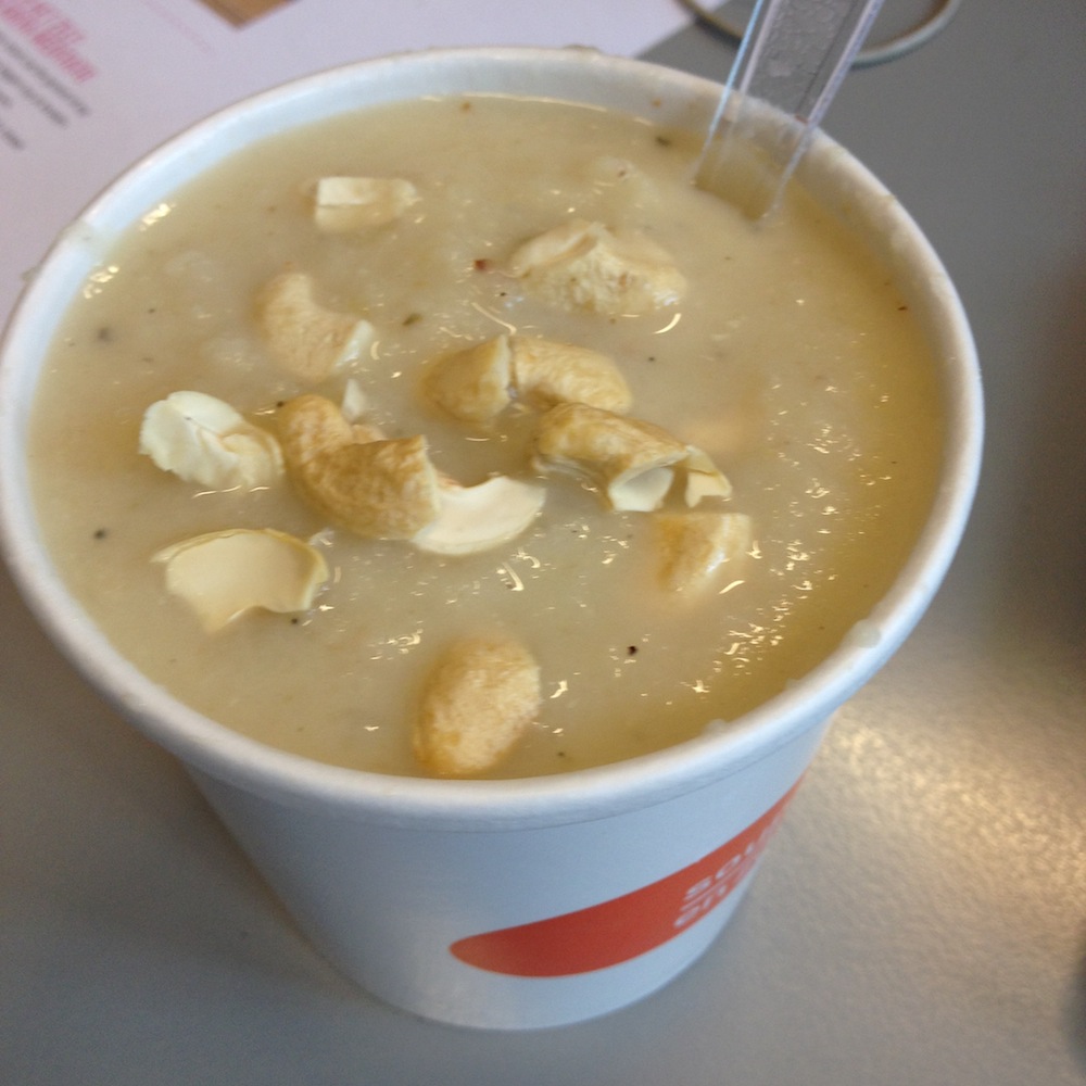 Ik begin weer met een groene smoothie, ditmaal van water met spinazie, bleekselderij, avocado en aardbeien. Daarna fiets ik naar de redactie van Yoga Magazine waar ik in de loop van de ochtend wat noten snoep en als lunch een knolselderijsoep met cashewnoten haal bij Soup en Zo. Erbij een stukje maïsbrood en een lik roomboter met zout.