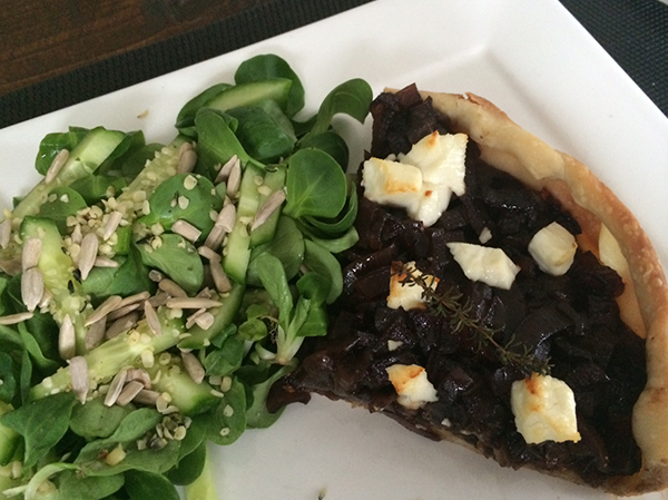 Eenmaal thuis eet ik twee pruimen en ga ik direct aan de slag met het avondeten: rode uientaart met geitenkaas en tijm met een eenvoudige salade ernaast.