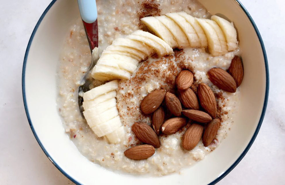Ik ontbijt met een glas appelsap en een schaaltje havermoutpap met noten en banaan; allemaal ingrediënten die ik nog in de keuken had liggen.