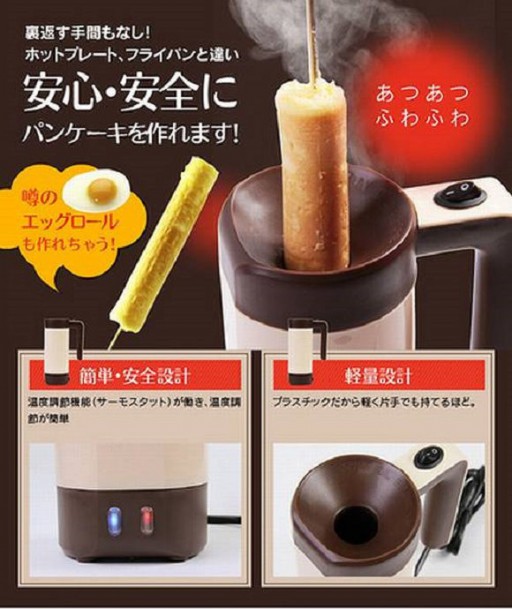 Dit is de Roky, een tool om pannenkoeken in lollyvorm te maken. Verticale pancakes, dus. Lijkt ons niet écht lekker.