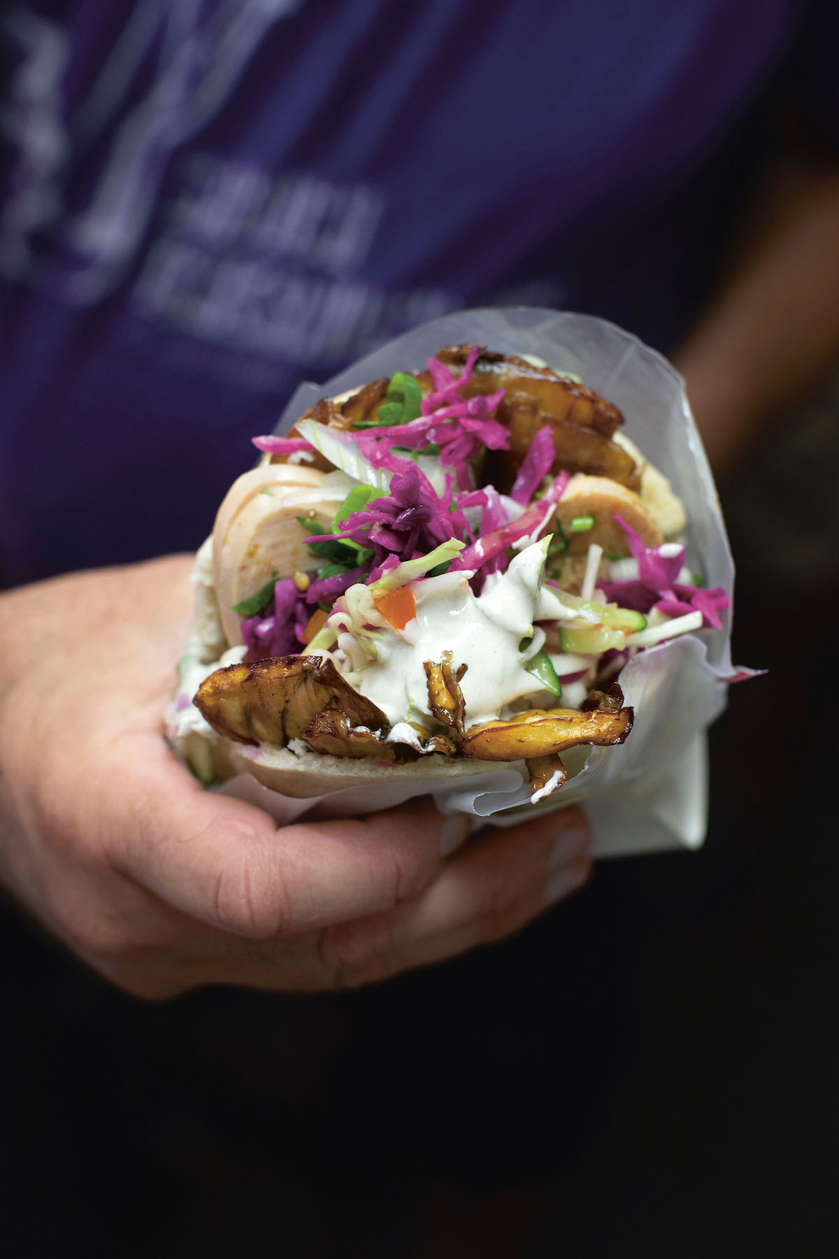 Zo’n pita kapsalon is allesbehalve een straf, maar mocht je het aandurven om in te grijpen, vraag de sabichboer dan om het bij aubergine, ei, Israëlische salade en de vier
