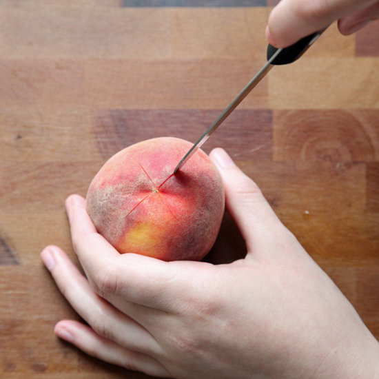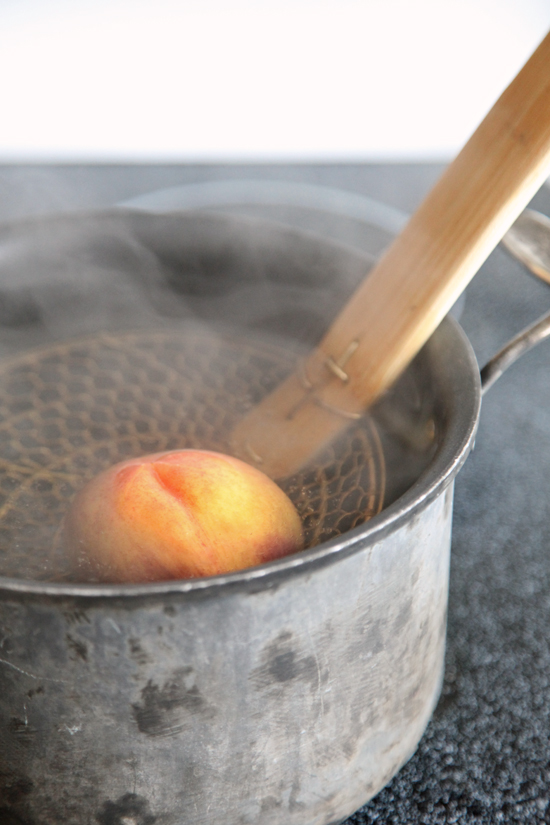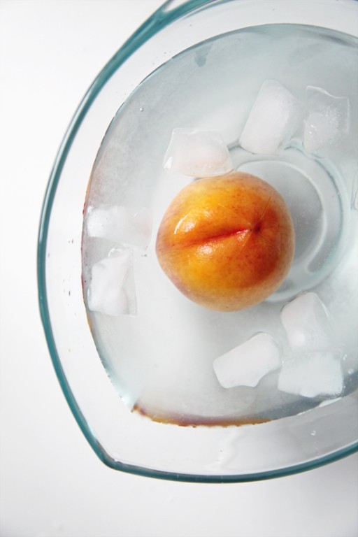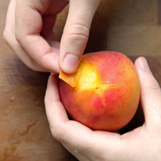 Kerf de perziken onderaan in met een scherp mes zodat er een kruisje verschijnt. Dompel ze veertig seconden onder in een pan met net gekookt water en zorg dat ze continu onder water blijven.