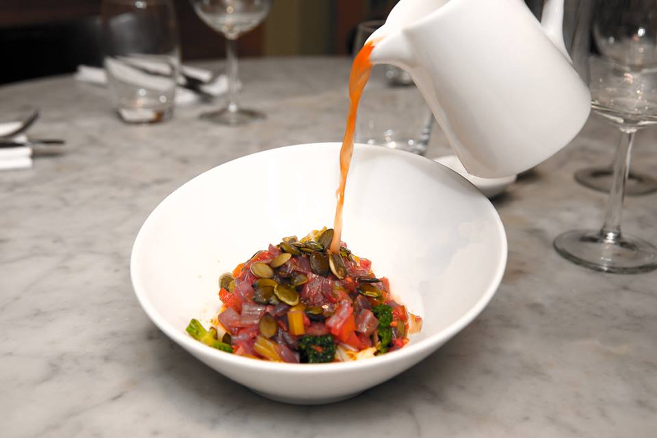 Wat dacht je van wilde eendenborst met een knolselderij-rösti en een saus van clementines als hoofdgerecht? En een chocoladetaartje met cacao nibs, gojibessen en gekaramelliseerde bananenijs toe. Het ijs wordt overigens gemaakt van kokosroom en honig. En de ‘Italian bread sticks’? Die worden gemaakt van gemalen amandel…