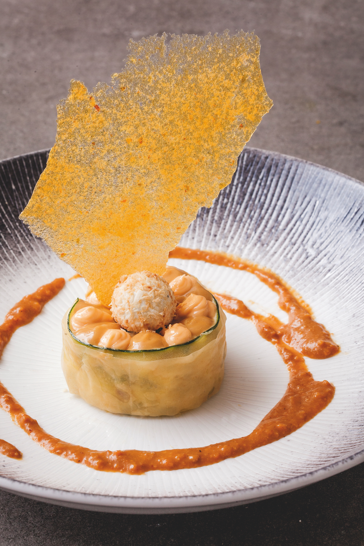 Ook Pascal’s signature dish staat in het boek: zijn gado gado. Geen verhollandste versie met kropsla, gekookt ei, aardappel, komkommer en satésaus. Pascal: “In Pangandaran in Indonesië zag ik langs de weg een mevrouw in een oelekan (vijzel) allemaal groenten tot moes wrijven. Ze bleek gado gado aan het maken te zijn. Ik proefde ‘m en zakte zowat door mijn hoeven. Ze maakte de gado gado gefaseerd: beetje boemboe erbij, beetje citroengras, beetje water, tot het echt een brij wordt. Het ziet er niet sexy uit, maar je weet niet wat je proeft. Ik dacht: als ik die smaken terug kan brengen, maar dan in een elegant gerecht… Dat is voor mij echt een eyeopener geweest: dít is dus de Indonesische keuken.”