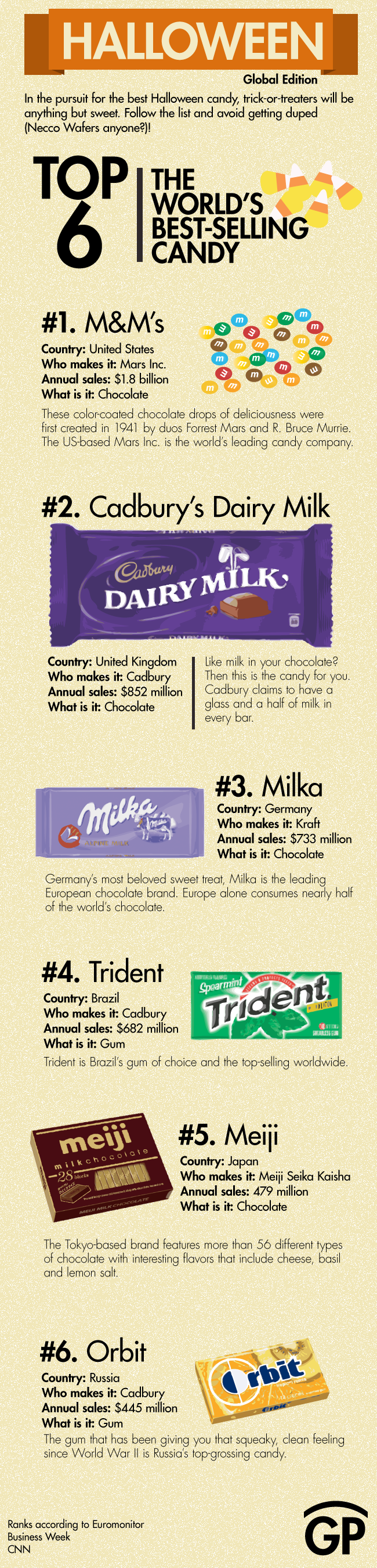 Deze infographic is weliswaar gemaakt voor Halloween, maar even handig voor Sint Maarten op 11 november. Wil je zeker weten dat je goed zit qua snoep? Haal dan de top 6 van ’s werelds best verkochte candy in huis.