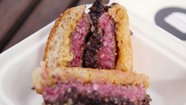 In deze video eet foodie Nick Solares bij het Londense Bleecker Burger een goddelijke hamburger met twee runderpatty’s, kaas én… bloedworst!