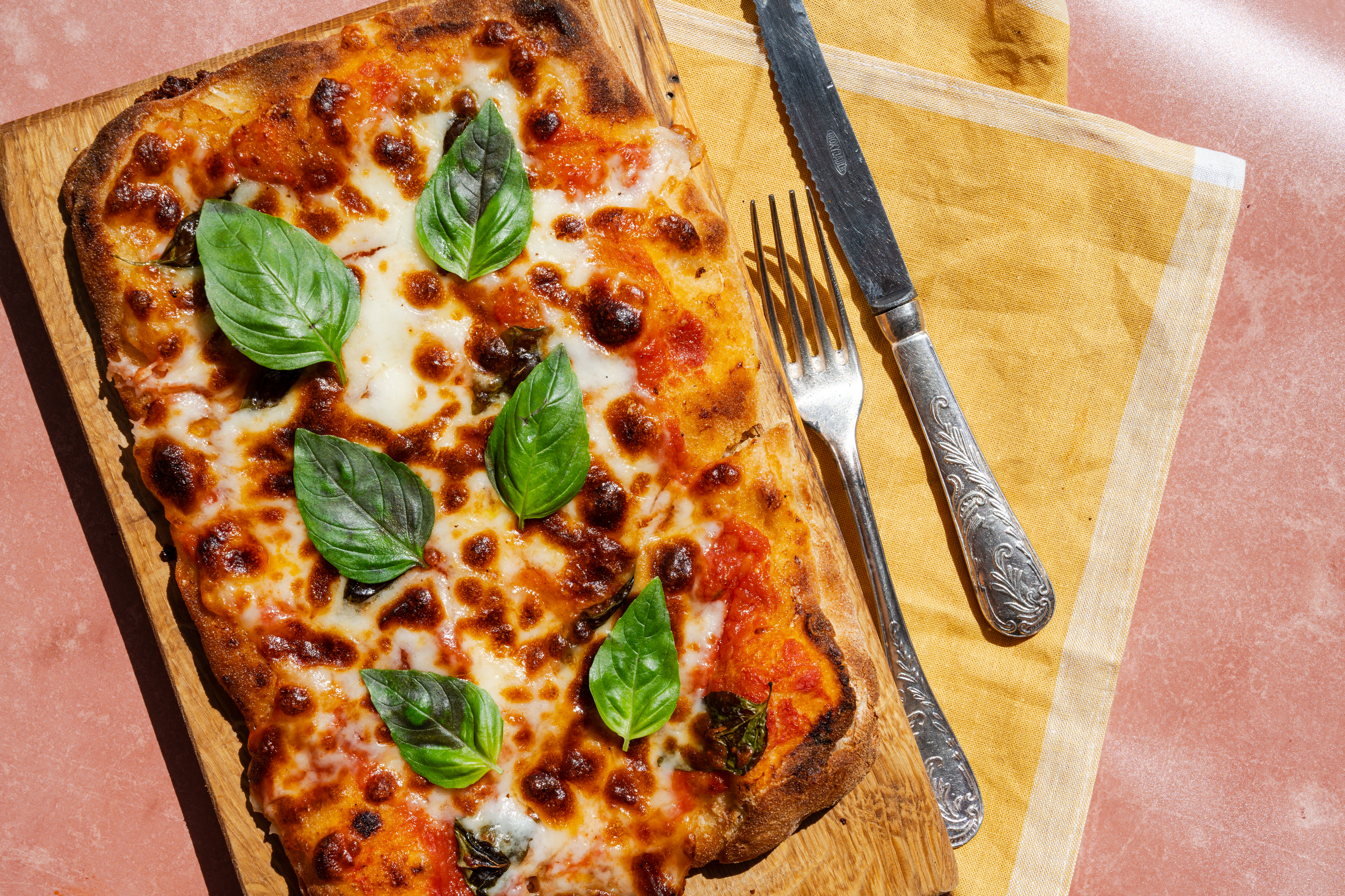 Altijd handig om in huis te hebben bij acute trek in pizza (of überhaupt acute trek): pinsa-bodems. Je belegt ze snel met wat San Marzano-tomaten uit blik (tip: vis de tomaten eruit, knijp ze fijn en verdeel ze over de pizza; het vocht gebruik je voor een tomatensaus – zo voorkom je een kleffe bodem), plakjes venkelsalami en mozzarella bijvoorbeeld. Of maak er een klassieke ‘Pinsa Margherita‘ van met mozzarella, Parmezaanse kaas en basilicum.