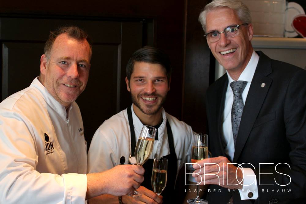 Ron Blaauw met de nieuwe Chef de Cuisine Bridges, Bobby Rust, en de general manager van het hotel, Remco Groenhuijzen