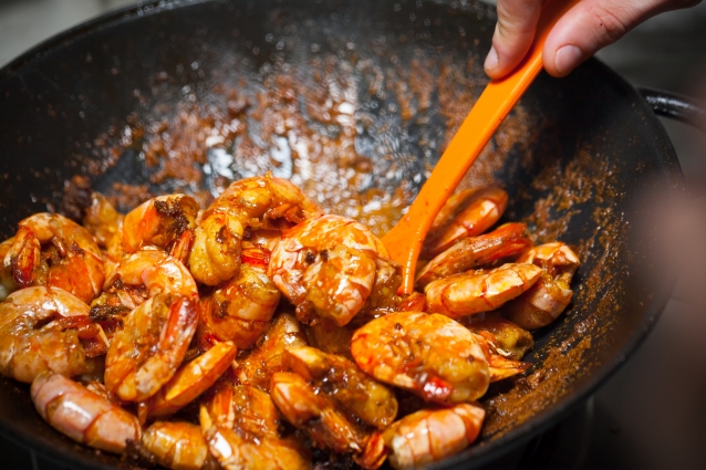 Veeg hierbij de bosui en gember ook goed over de zijkanten van de wok. Als deze te droog wordt kan je nog een scheutje olie toevoegen. De wok zal op een gegeven moment licht geel-bruin kleuren. Klaar ben je!