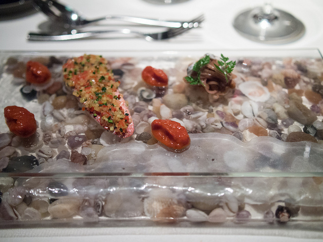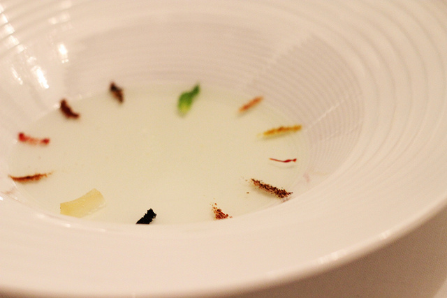 Elk gerecht zou elke zintuig moeten stimuleren en verrassen, van de smaak tot een aanraking en van de geur tot hoe het eruit ziet. Het gerecht op onderstaande foto bijvoorbeeld, speelt met de ’textuur’ van lucht. De Parmezaanse kaas wonton is een knapperig buideltje gevuld met lucht, en het basilicumschuim is simpelweg luchtig gemaakt basilicumsap.