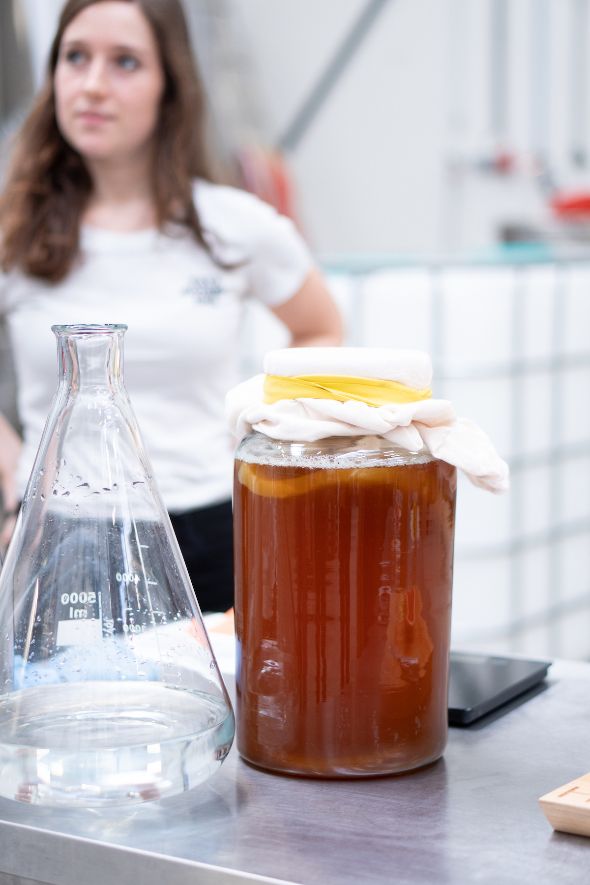 Eerst laten ze héle sterke thee een aantal uur trekken in grote tanks om alle smaken en aroma’s te onttrekken. Daar gaat biologische rietsuiker bij. Je zou ook honing kunnen gebruiken, maar feit blijft dat je in ieder geval altijd een suikerbron nodig hebt die de bacteriën en gisten die bij fermentatie vrijkomen, omzetten in zuren. “Zonder suiker geen kombucha”, aldus het duo.