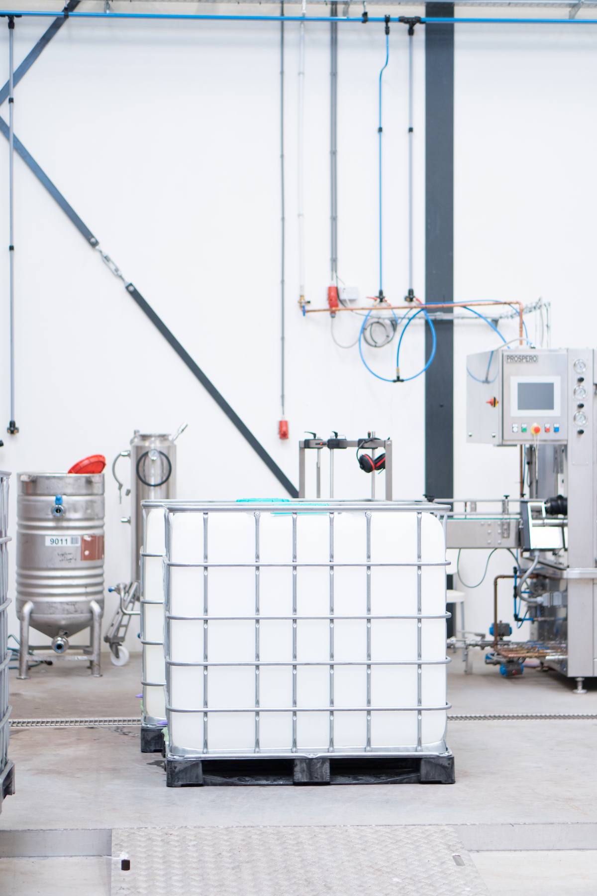 De kombucha wordt afgesloten en moet nu gaan fermenteren. Dat gebeurt hier bij 28 graden, in enorme jerrycans.
