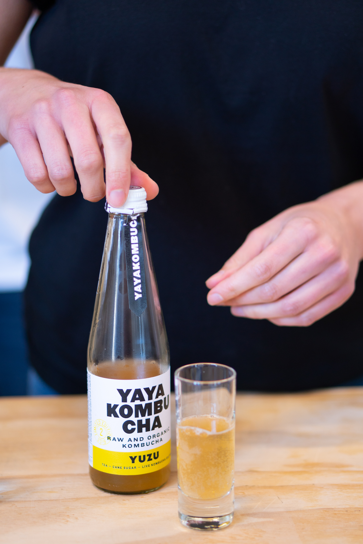 Maar hoe krijgt de kombucha van YAYA Kombucha zo’n lekker smaakje? Die met yuzu bijvoorbeeld? Het toevoegen van de smaken gebeurt tijdens de tweede fermentatie: “dat gebeurt op de fles”, aldus Charlotte. Bij YAYA Kombucha werken ze daarvoor alleen met sappen. Fruitsappen zoals yuzu (die wordt uit Japan gehaald), maar ook bosbessen of gember, die worden toegevoegd aan de kombucha.