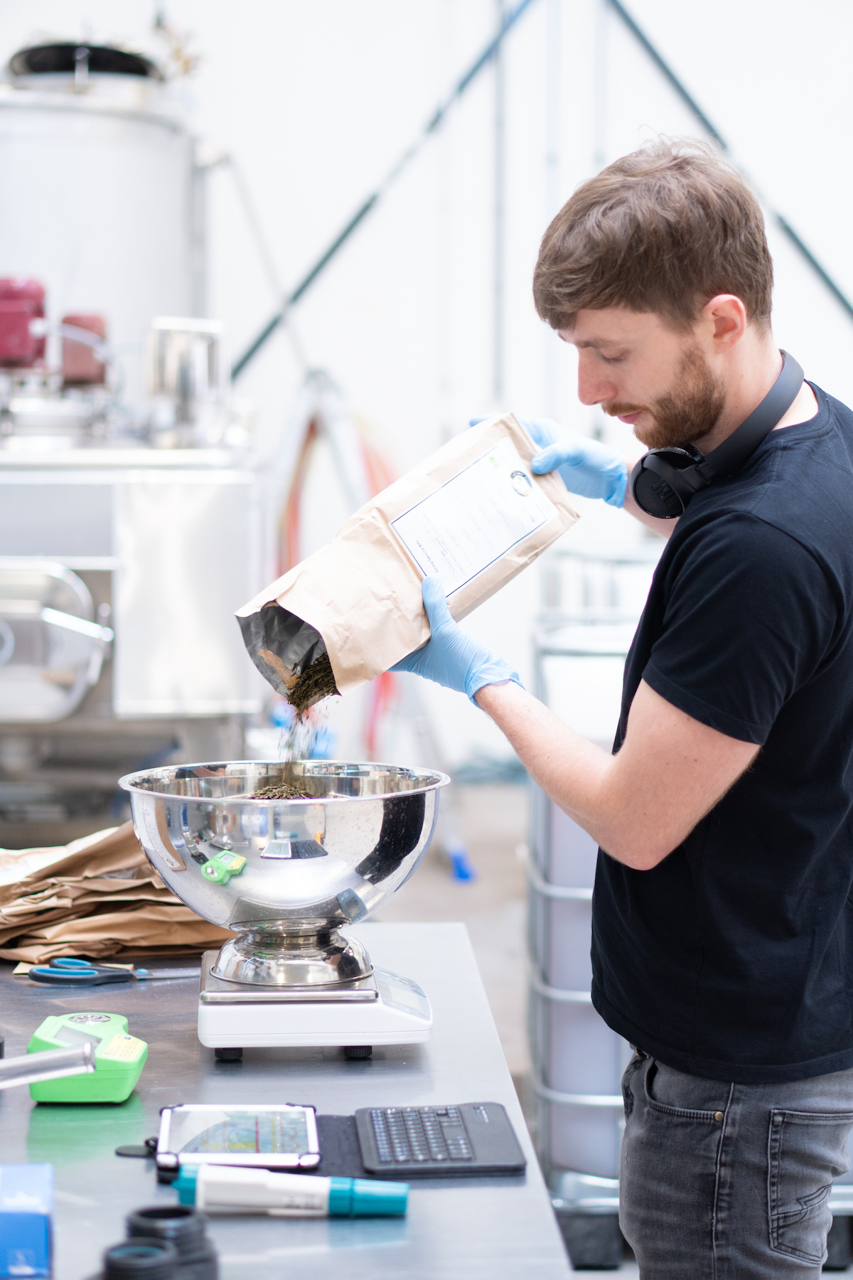 Yaya Kombucha maakt kombucha van een mix van groene thee en zwarte thee uit China. “Zou je het alleen van de groene thee maken, dan wordt de kombucha vaak heel licht, maar het bevat wel veel umami”, zegt Charlotte. “Zwarte thee geeft wat meer body aan de kombucha en zeker na fermentatie zorgt ‘ie voor wat meer geur en funk. Wij vinden dat heel lekker”.