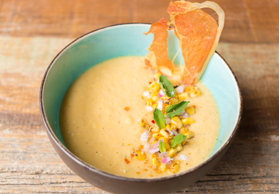 - Meloen gazpacho van cantaloupe, maïs en munt