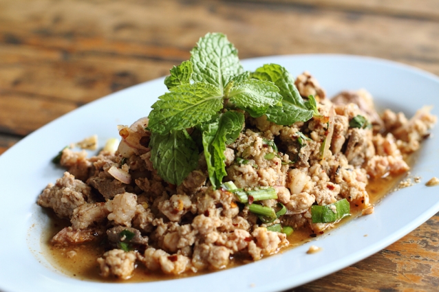 Laab is van oorsprong een Laotiaans gerecht – uit Laos dus – maar je komt het ook weleens tegen in de Thaise keuken. Het wordt gemaakt met gehakt, vissaus, limoen, chili, munt en gepofte rijst.