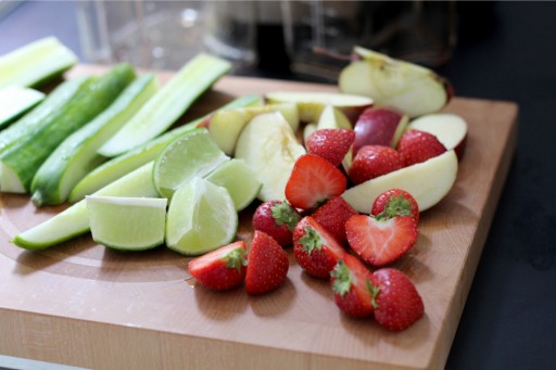 Komkommer, aardbeien, appel, limoen