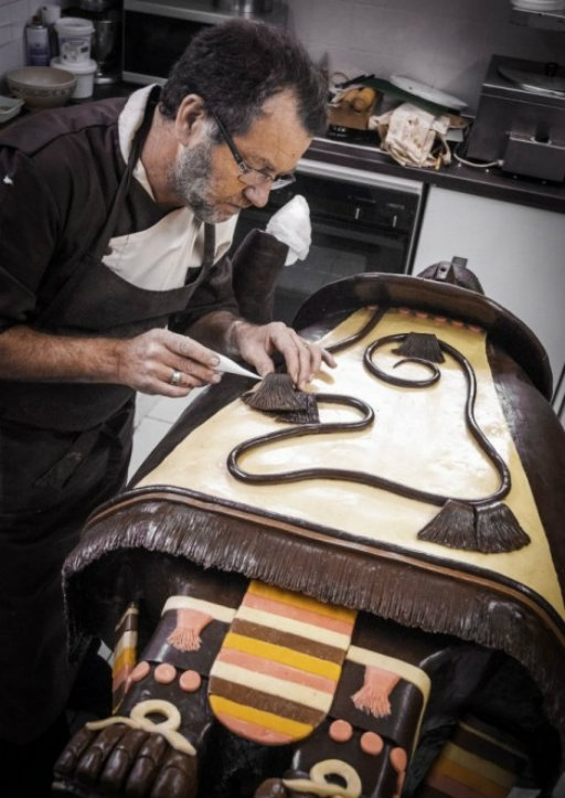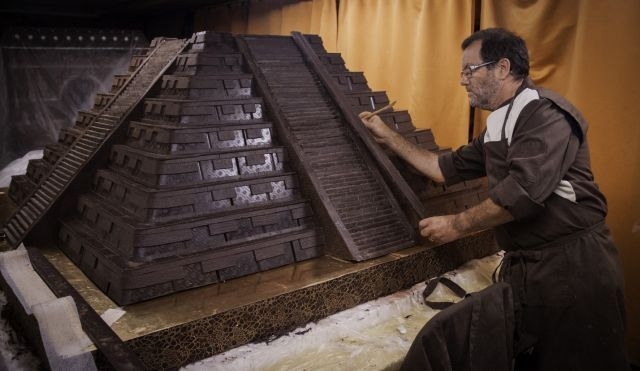 Geïnspireerd door het thema maakt chocolade artiest Jean-Luc Decluzeau de tempel van de Azteekse god Quetzalcoatl, god van de chocolade, geheel van chocolade.
